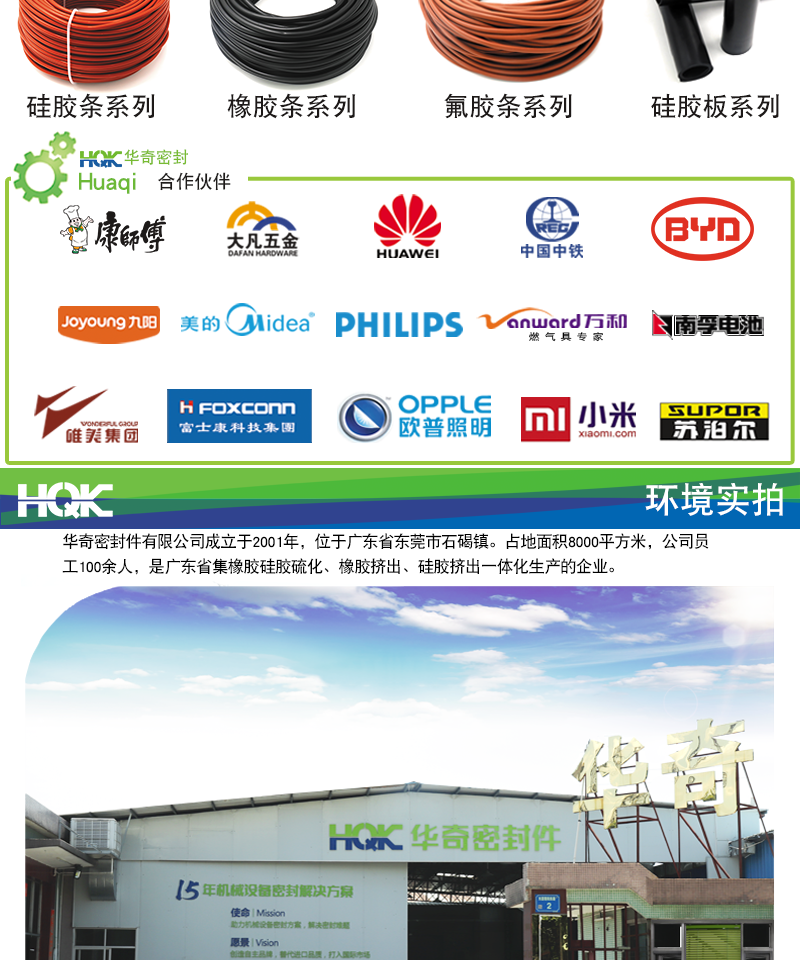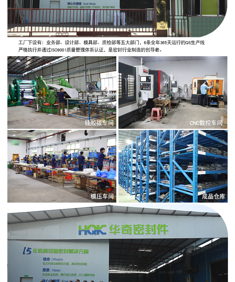 東莞市華奇密封件有限公司成立于2006年,位于廣東省東莞市石碣鎮(zhèn),占地面積10000平方米,公司員工150余人,是廣東省集橡膠硅膠硫化、橡膠擠出、硅膠擠出一體化生產(chǎn)的新型企業(yè)。 本公司主營產(chǎn)品有:大型盾構(gòu)機(jī)密封圈,充氣密封圈,烤箱密封圈,密封條,真空吸盤,密封圈O型圈,密封圈護(hù)線圈,金屬包膠等非標(biāo)定制硅橡膠制品。 東莞市華奇密封件有限公司材料庫擁有超過數(shù)百種獨(dú)特的配方,并擁有在嚴(yán)苛環(huán)境下,如極端溫度、介質(zhì)侵蝕、超高壓力時(shí)也具有優(yōu)良的密封材料。高性能橡膠、硅膠原材料、全自動生產(chǎn)設(shè)備及先進(jìn)的檢驗(yàn)設(shè)備,為制造高質(zhì)量的橡膠零件提供了強(qiáng)有力的保障。公司采用先進(jìn)的管理理念,引進(jìn)精良的工藝裝備和高素質(zhì)的員工隊(duì)伍,在多年的工作過程中,把嚴(yán)格的品質(zhì)落實(shí)在生產(chǎn)流程的每一個(gè)細(xì)節(jié)中,嚴(yán)格執(zhí)行行業(yè)標(biāo)準(zhǔn),規(guī)范操作,用科學(xué)嚴(yán)謹(jǐn)?shù)墓ぷ鲬B(tài)度確保華奇每一件產(chǎn)品精準(zhǔn)可靠。產(chǎn)品暢銷全國近三十多個(gè)省、市自治區(qū)及遠(yuǎn)銷國外。竭誠與國內(nèi)外商家雙贏合作,共同發(fā)展,共創(chuàng)輝煌!