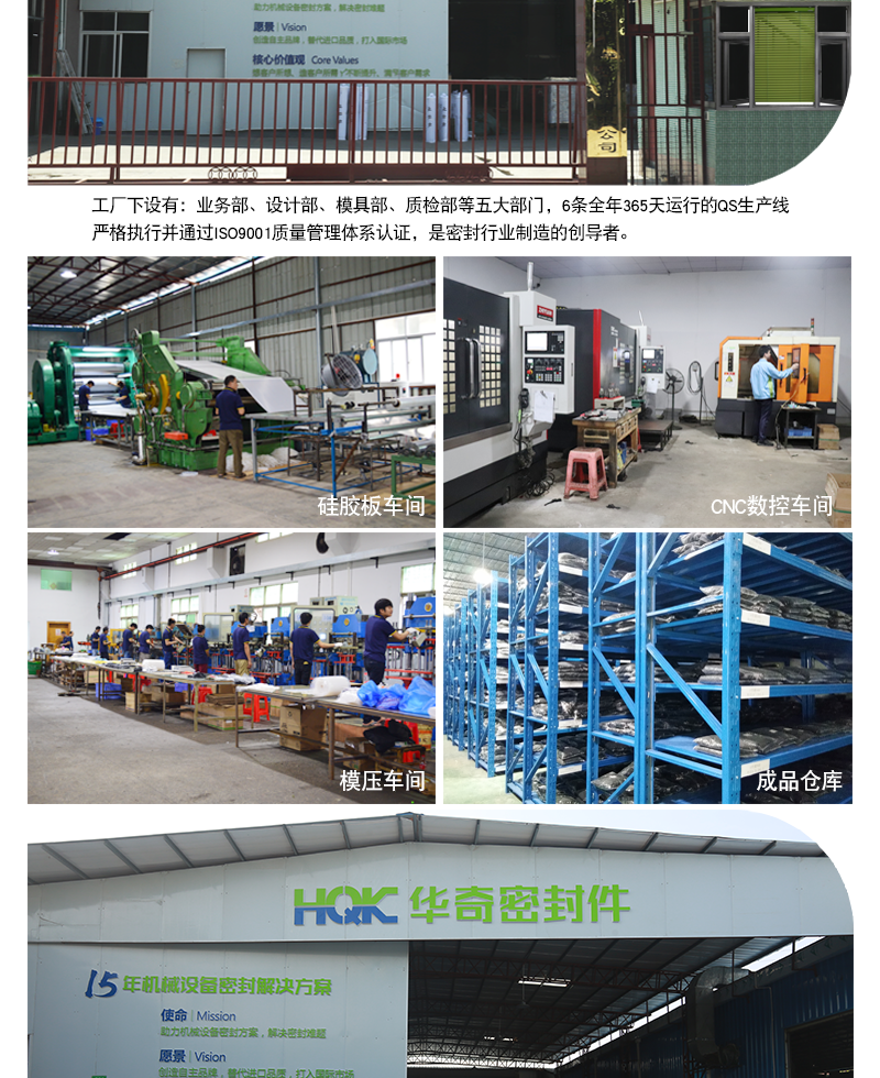 東莞市華奇密封件有限公司成立于2006年,位于廣東省東莞市石碣鎮(zhèn),占地面積10000平方米,公司員工150余人,是廣東省集橡膠硅膠硫化、橡膠擠出、硅膠擠出一體化生產(chǎn)的新型企業(yè)。 本公司主營產(chǎn)品有:大型盾構(gòu)機(jī)密封圈,充氣密封圈,烤箱密封圈,密封條,真空吸盤,密封圈O型圈,密封圈護(hù)線圈,金屬包膠等非標(biāo)定制硅橡膠制品。 東莞市華奇密封件有限公司材料庫擁有超過數(shù)百種獨(dú)特的配方,并擁有在嚴(yán)苛環(huán)境下,如極端溫度、介質(zhì)侵蝕、超高壓力時(shí)也具有優(yōu)良的密封材料。高性能橡膠、硅膠原材料、全自動(dòng)生產(chǎn)設(shè)備及先進(jìn)的檢驗(yàn)設(shè)備,為制造高質(zhì)量的橡膠零件提供了強(qiáng)有力的保障。公司采用先進(jìn)的管理理念,引進(jìn)精良的工藝裝備和高素質(zhì)的員工隊(duì)伍,在多年的工作過程中,把嚴(yán)格的品質(zhì)落實(shí)在生產(chǎn)流程的每一個(gè)細(xì)節(jié)中,嚴(yán)格執(zhí)行行業(yè)標(biāo)準(zhǔn),規(guī)范操作,用科學(xué)嚴(yán)謹(jǐn)?shù)墓ぷ鲬B(tài)度確保華奇每一件產(chǎn)品精準(zhǔn)可靠。產(chǎn)品暢銷全國近三十多個(gè)省、市自治區(qū)及遠(yuǎn)銷國外。竭誠與國內(nèi)外商家雙贏合作,共同發(fā)展,共創(chuàng)輝煌!