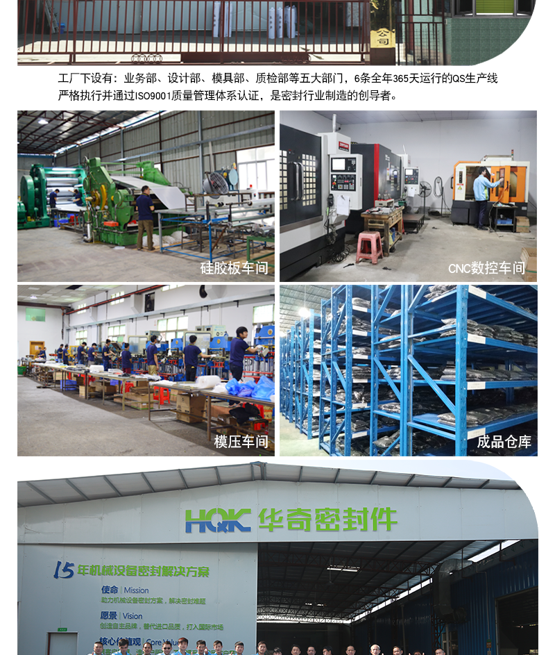 東莞市華奇密封件有限公司成立于2006年,位于廣東省東莞市石碣鎮(zhèn),占地面積10000平方米,公司員工150余人,是廣東省集橡膠硅膠硫化、橡膠擠出、硅膠擠出一體化生產(chǎn)的新型企業(yè)。 本公司主營產(chǎn)品有:大型盾構機密封圈,充氣密封圈,烤箱密封圈,密封條,真空吸盤,密封圈O型圈,密封圈護線圈,金屬包膠等非標定制硅橡膠制品。 東莞市華奇密封件有限公司材料庫擁有超過數(shù)百種獨特的配方,并擁有在嚴苛環(huán)境下,如極端溫度、介質侵蝕、超高壓力時也具有優(yōu)良的密封材料。高性能橡膠、硅膠原材料、全自動生產(chǎn)設備及先進的檢驗設備,為制造高質量的橡膠零件提供了強有力的保障。公司采用先進的管理理念,引進精良的工藝裝備和高素質的員工隊伍,在多年的工作過程中,把嚴格的品質落實在生產(chǎn)流程的每一個細節(jié)中,嚴格執(zhí)行行業(yè)標準,規(guī)范操作,用科學嚴謹?shù)墓ぷ鲬B(tài)度確保華奇每一件產(chǎn)品精準可靠。產(chǎn)品暢銷全國近三十多個省、市自治區(qū)及遠銷國外。竭誠與國內外商家雙贏合作,共同發(fā)展,共創(chuàng)輝煌!
