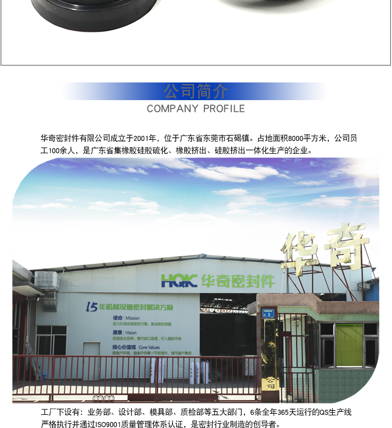 東莞市華奇密封件有限公司成立于2006年,位于廣東省東莞市石碣鎮(zhèn),占地面積10000平方米,公司員工150余人,是廣東省集橡膠硅膠硫化、橡膠擠出、硅膠擠出一體化生產(chǎn)的新型企業(yè)。 本公司主營產(chǎn)品有:大型盾構(gòu)機(jī)密封圈,充氣密封圈,烤箱密封圈,密封條,真空吸盤,密封圈O型圈,密封圈護(hù)線圈,金屬包膠等非標(biāo)定制硅橡膠制品。 東莞市華奇密封件有限公司材料庫擁有超過數(shù)百種獨特的配方,并擁有在嚴(yán)苛環(huán)境下,如極端溫度、介質(zhì)侵蝕、超高壓力時也具有優(yōu)良的密封材料。高性能橡膠、硅膠原材料、全自動生產(chǎn)設(shè)備及先進(jìn)的檢驗設(shè)備,為制造高質(zhì)量的橡膠零件提供了強(qiáng)有力的保障。公司采用先進(jìn)的管理理念,引進(jìn)精良的工藝裝備和高素質(zhì)的員工隊伍,在多年的工作過程中,把嚴(yán)格的品質(zhì)落實在生產(chǎn)流程的每一個細(xì)節(jié)中,嚴(yán)格執(zhí)行行業(yè)標(biāo)準(zhǔn),規(guī)范操作,用科學(xué)嚴(yán)謹(jǐn)?shù)墓ぷ鲬B(tài)度確保華奇每一件產(chǎn)品精準(zhǔn)可靠。產(chǎn)品暢銷全國近三十多個省、市自治區(qū)及遠(yuǎn)銷國外。竭誠與國內(nèi)外商家雙贏合作,共同發(fā)展,共創(chuàng)輝煌!